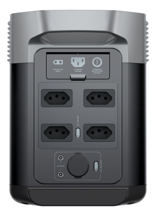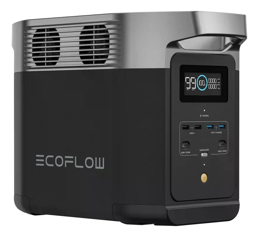 Delta 2 • Capacidade: 1024Wh • Potência de saída: 1800W (pico 2400W) • Peso: 12 kg • Dimensões: 40 x 21 x 28 cm